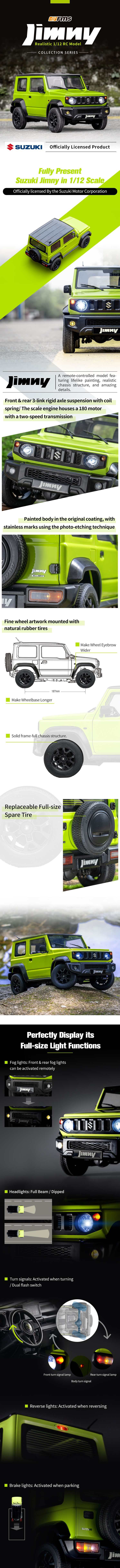 - From the amazingly detailed interior, outer body, or chassis and suspension, this is an RC model that replicates its full-size counterpart in virtually every area. The 1:12 Suzuki Jimny is ready to conquer the wilderness.